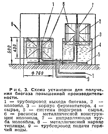Особенность этого варианта установки - устройство колокола 138 см и высотой 150 см из прорезиненного полотна, применяемого для изготовления надувных лoдок. Ферментатор представляет собой металлический резервуар 140х380 см и имеет объем 4,7 м3. Колокол вводится в находящийся в ферментаторе навоз на глубину не менее 30 см для обеспечения гидравлического заслона выходу биогаза в атмосферу. В верхней части разбухающего резервуара предусмотрен кран, соединенный со шлангом; по нему газ поступает к газовой плите с тремя конфорками и колонке для нагрева воды. Чтобы обеспечить оптимальные условия для работы ферментатора, навоз смешивается с горячей водой.