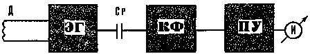 Эталонный генератор ЭГ вырабатывает синусоидальное напряжение частотой 50 кГц. Контурная катушка, определяющая частоту генерации, является датчиком Д прибора. Сигнал синусоидальной формы через разделительный конденсатор Ср поступает на кварцевый фильтр КФ.